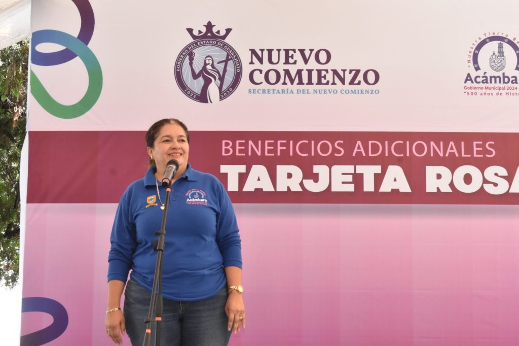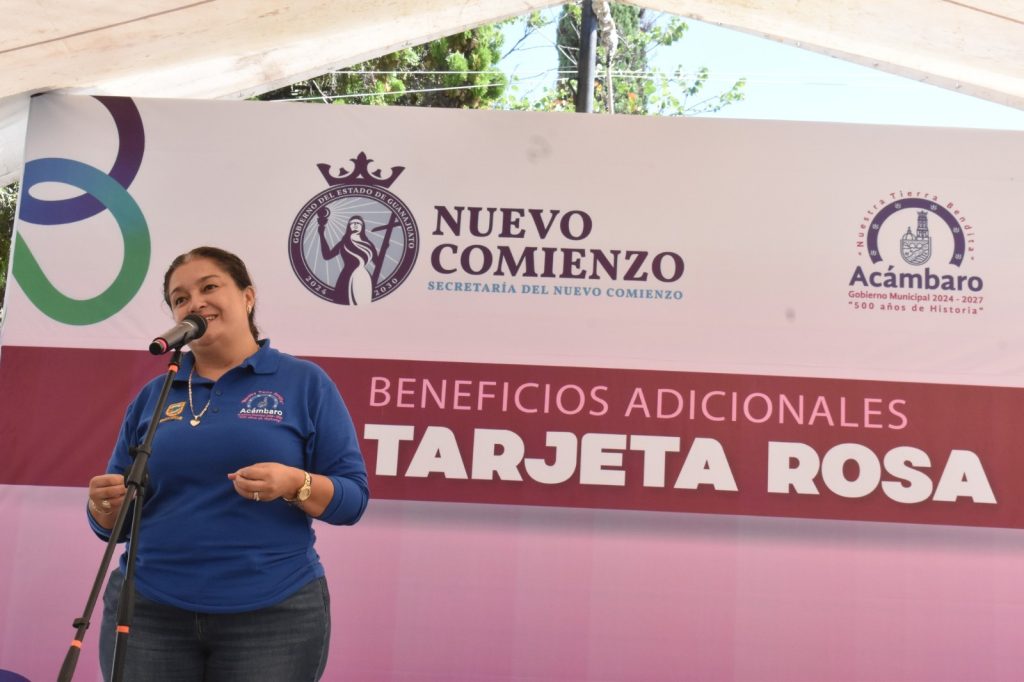 Habló sobre los logros alcanzado y beneficios adicionales que ofrece el Programa de la Tarjeta Rosa, mencionado que en Acámbaro hay 11,000 mujeres que ya están recibiendo estos apoyos. Entre los apoyos adicionales que ofrece este programa a las mujeres se encuentran asesoría jurídica, servicio médico a domicilio para la mujer y su familia, servicios técnicos en el hogar, gastos funerarios, entre otros.
